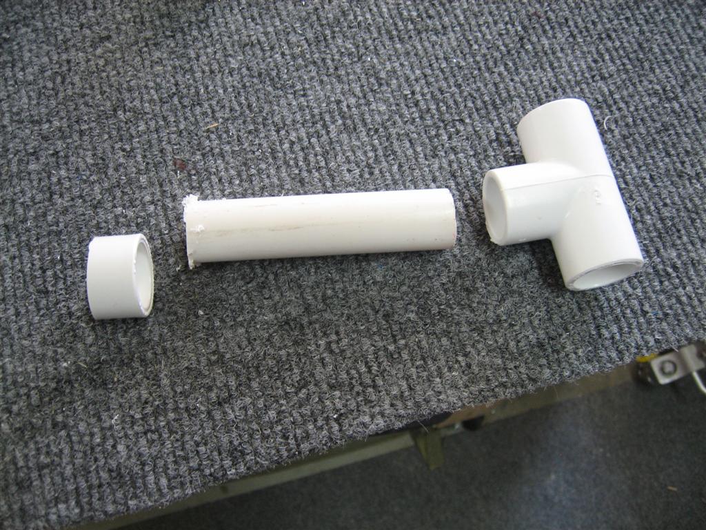 All you’ll need is a “T” fitting, a coupling, and a length of 1/2″ PVC. They usually sell the pipe in 10′ sections, but if you dig through the pile, you can usually find a scrap piece that they’ll give you a discount on. I ended up finding a 6′ piece, but half was damaged beyond use. They marked it down from $1.53 to $0.51.