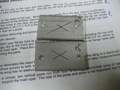 The bolt in the lower right hole is the one from the single (of 8) holes they tell you to drill in advance. You use a bolt to line up that hole and then picot the whole assembly around that point to 90° of the spar. Then matchdrill.