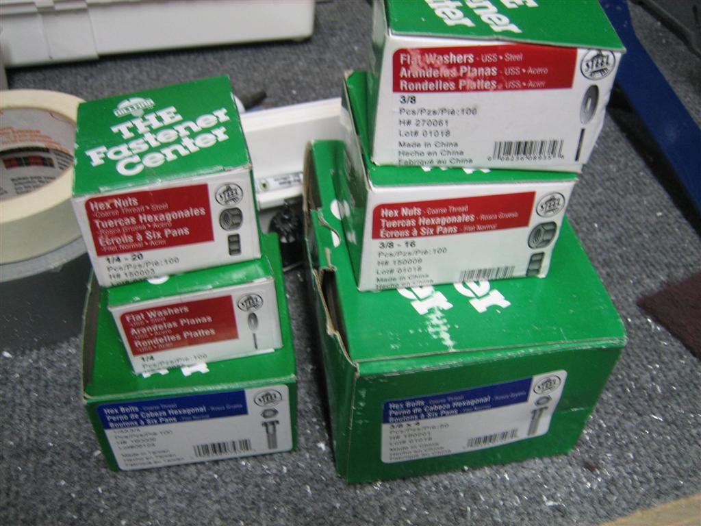 First thing, I reorganized the garage to make room for the wing stands. Then, I started gathering all of the necessary hardware. Yesterday, I went to the hardware store and started counting out individual pieces that I would need. I quickly realized that I could always use a good inventory of 1/4″ and 3/8″ nuts, bolts, and washers, so I bought the contractor packs.