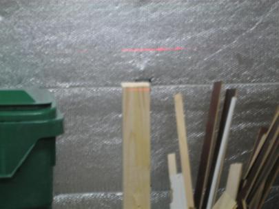 This thing is awesome (it’s my girlfriend’s). I held it up against one support and moved it up or down until the level line across the garage was right on the top edge of the post (the picture below shows me about 1/2″ too low). When the level line was even with the very top edge, I marked a line under the laser leveler (it has a little hole for marking), and then I measured down from that line (and the top of the other post) 2 inches to mark a spot for drilling.