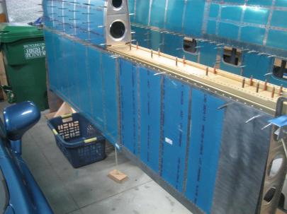 After taking the right upper outboard skin inside to deburr and scuff (AND VACUUM THE LITTLE ALUMINUM SHAVINGS OFF THE COUNTER, SORRY GIRLFRIEND!!!), I brought it back outside, and stored it (like the inboard skin), upside down (or inside out) on the left wing.