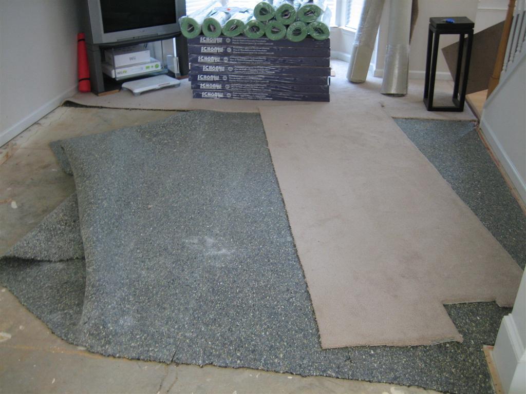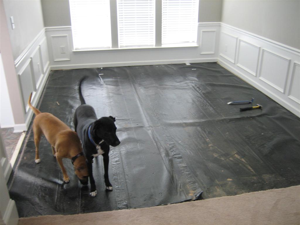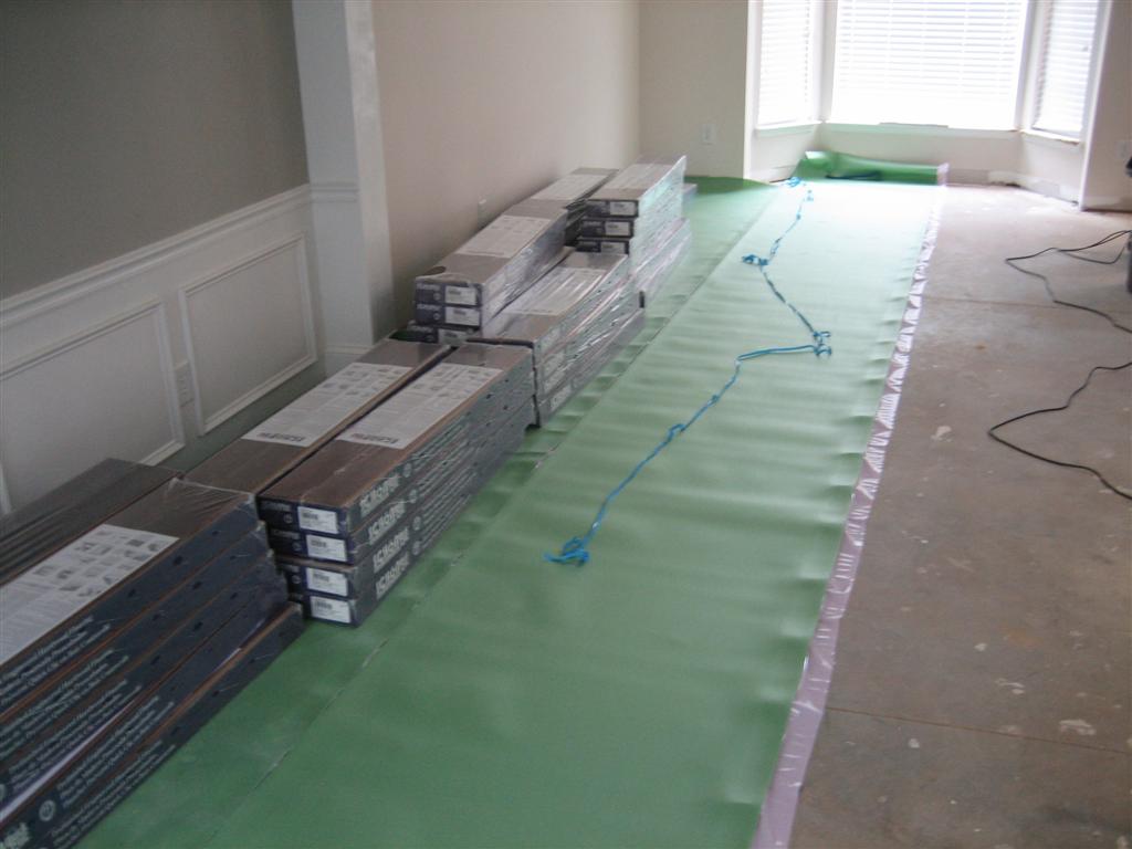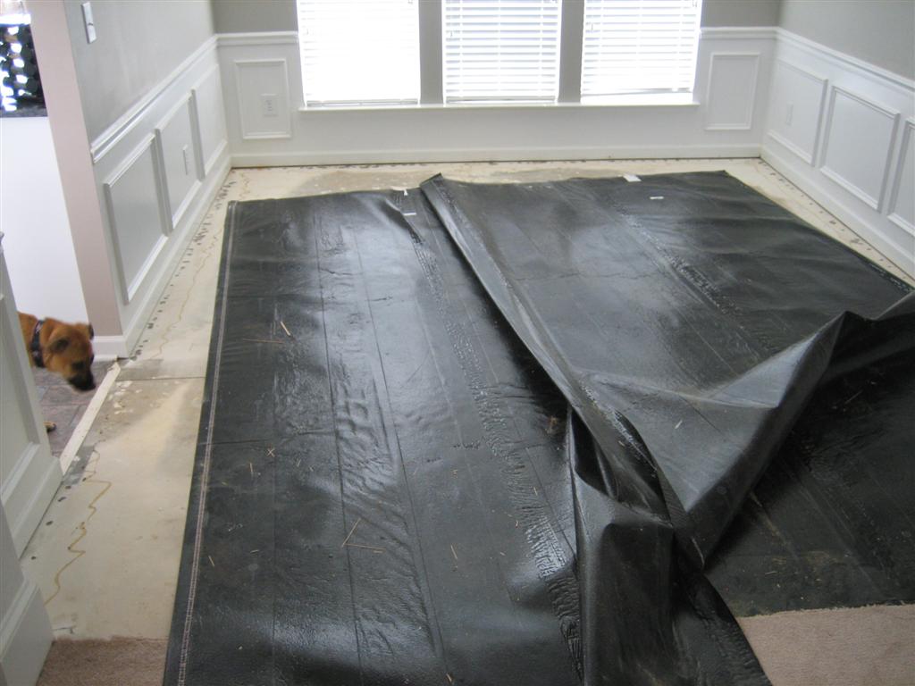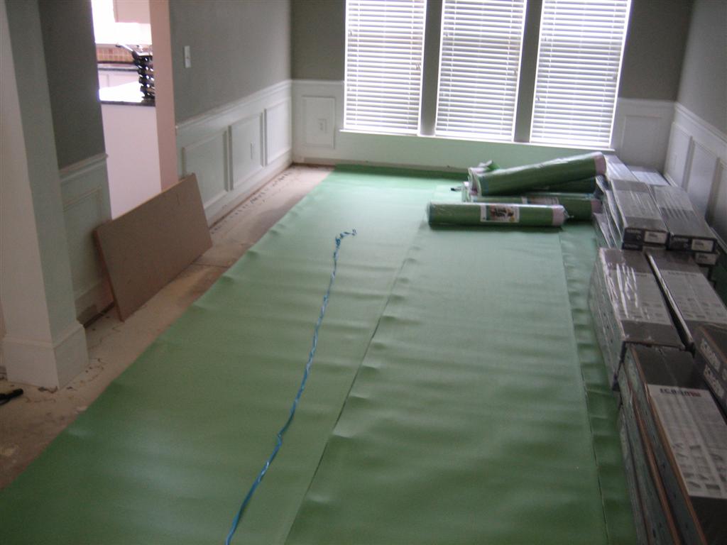 After spending a couple days prepping and paiting the dining room and living room cieling room, I was finally given the okay to really start on the floors. First thing was to really make sure the floors were clean, then start unrolling the underlayment.