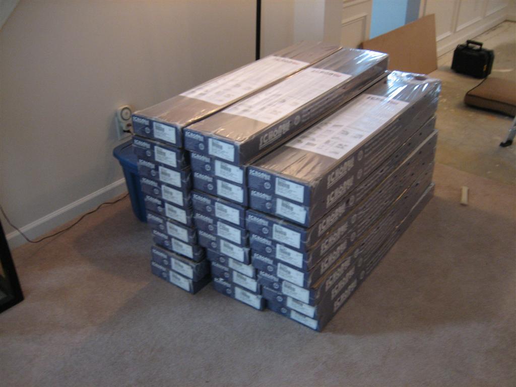 I have to start in the bay window area, so once I got the third row in, I stopped because I am too excited to actually get some of this stuff down. Here are a couple boxes opened and just scattered randomly.