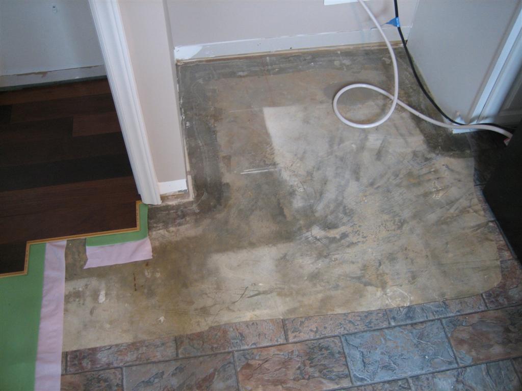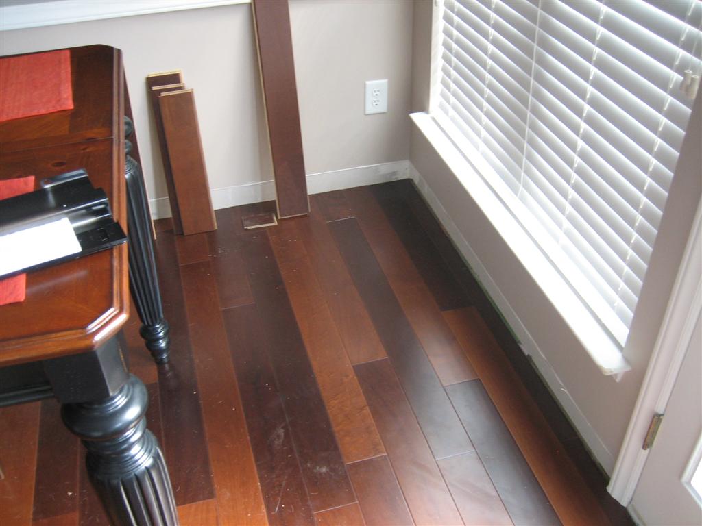 Long story short, the floors in my house are kind of weird. On the first floor, I’ve got good wood floors in the foyer, carpet in the living and family rooms, vinyl tile-look-alike in the kitchen, and laminate flooring in the dining room that was not installed correctly.