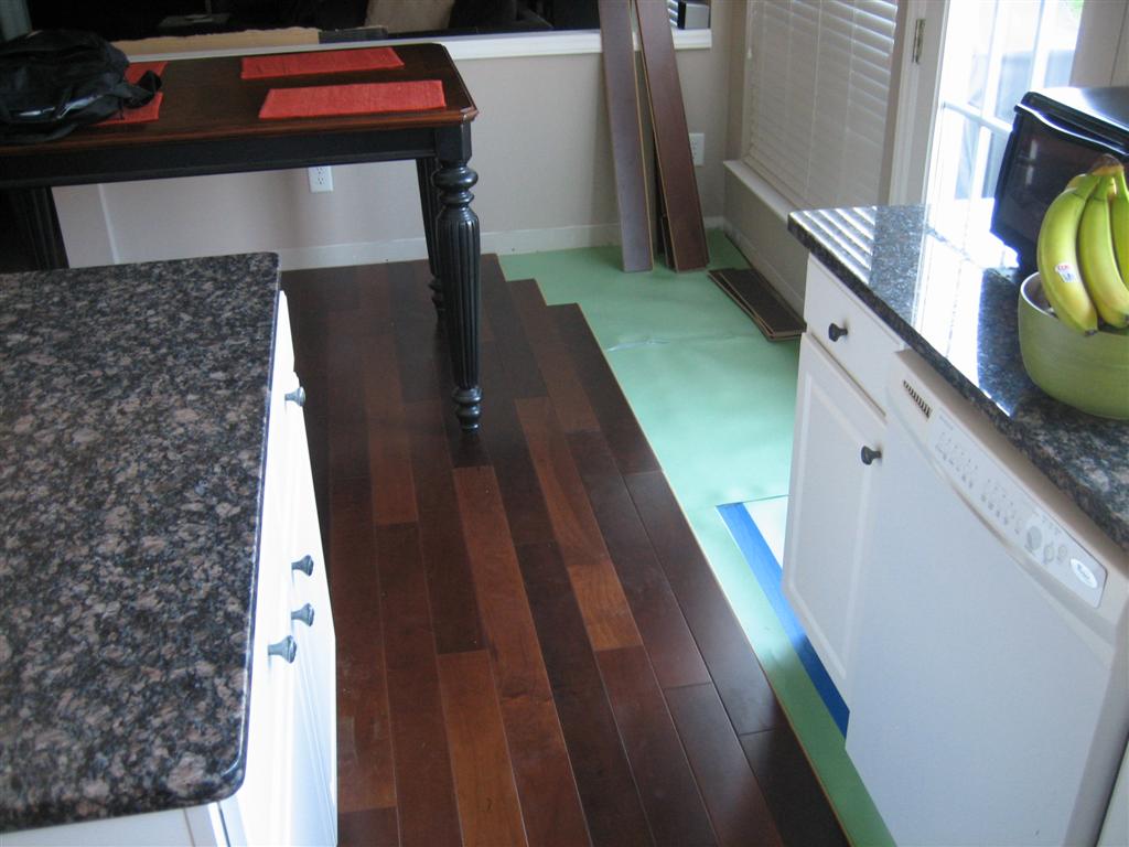 Instead of pulling up everything in the kitchen now, I decided to “turn the corner” into the family room, and work upwards toward the wall. This way, I could get a big chunk of room done without interrupting the family using the kitchen on a daily basis.