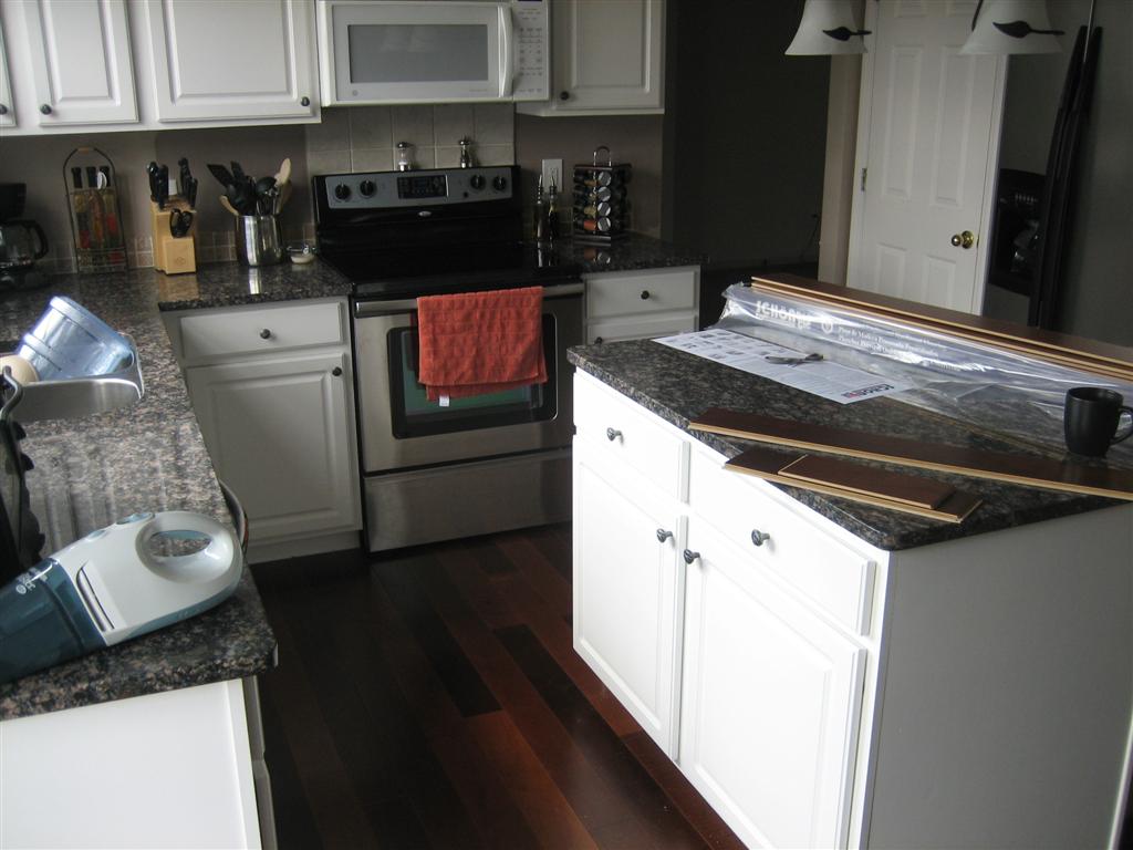 Today, the girlfriend is going to paint the trim in the kitchen while I FINALLY get all of the flooring layed. (Except in the powder room, which we are fully renovating…in a few weeks.)
