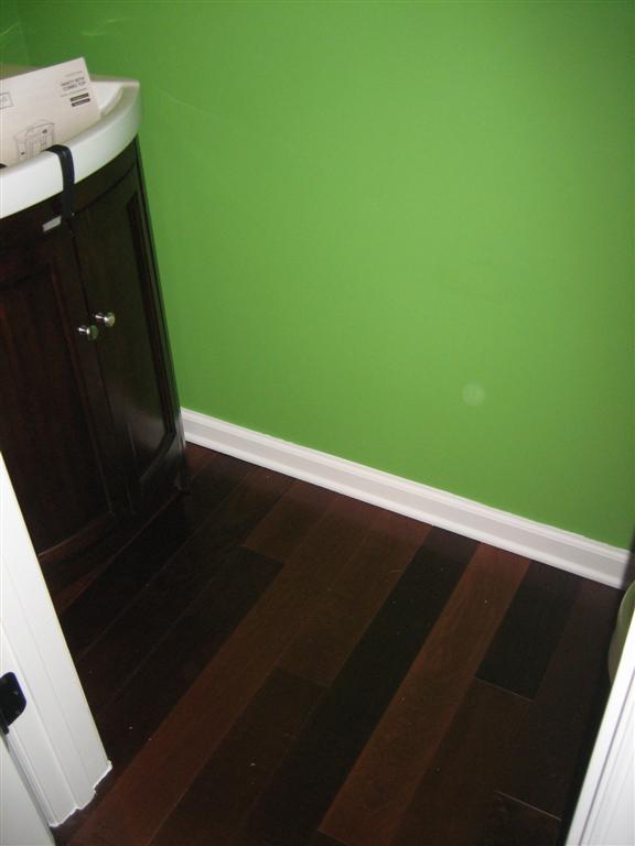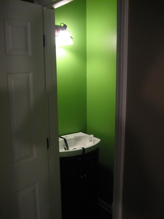Well, I thought I’d be done by now, but I am pretty darn close. I got the trim and the shoe molding up in the family room, and we’re basically putting the final touches up (still need mirror, hardware, and faucet) in the powder room.