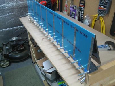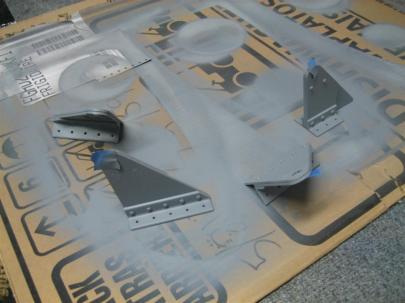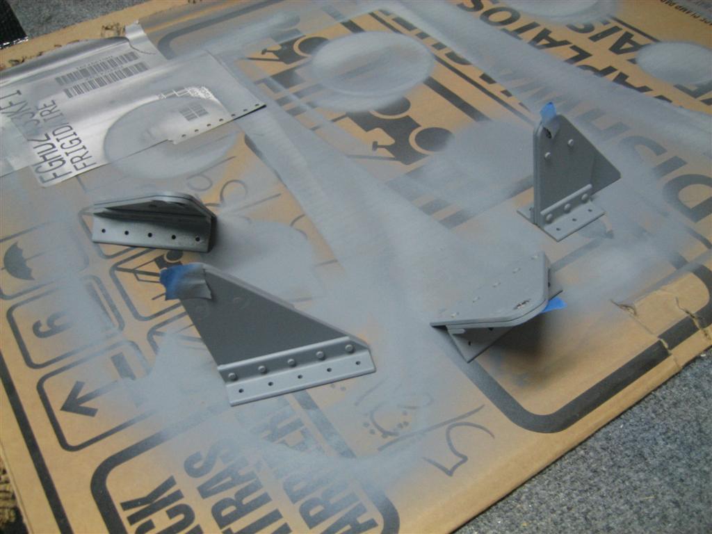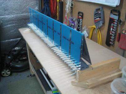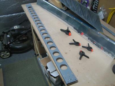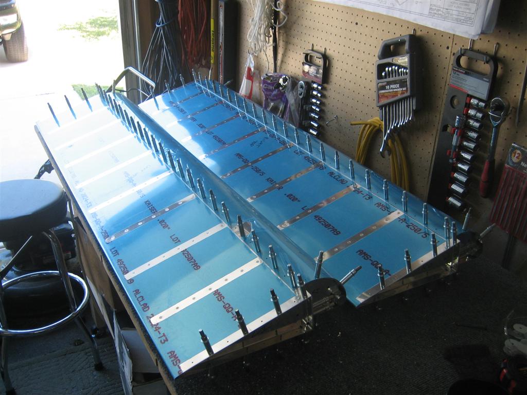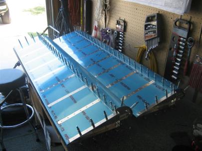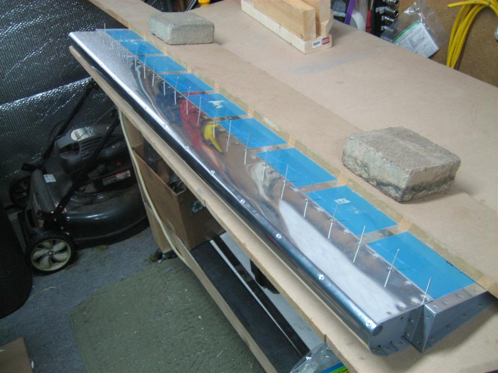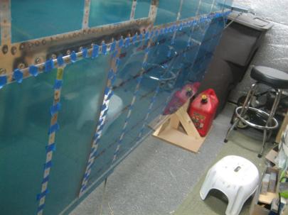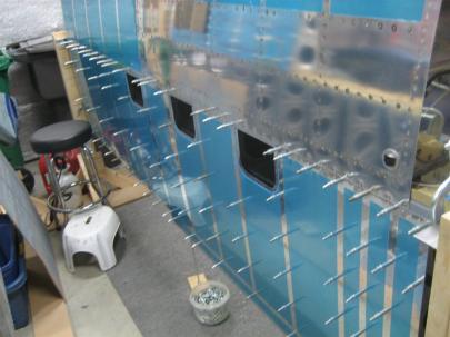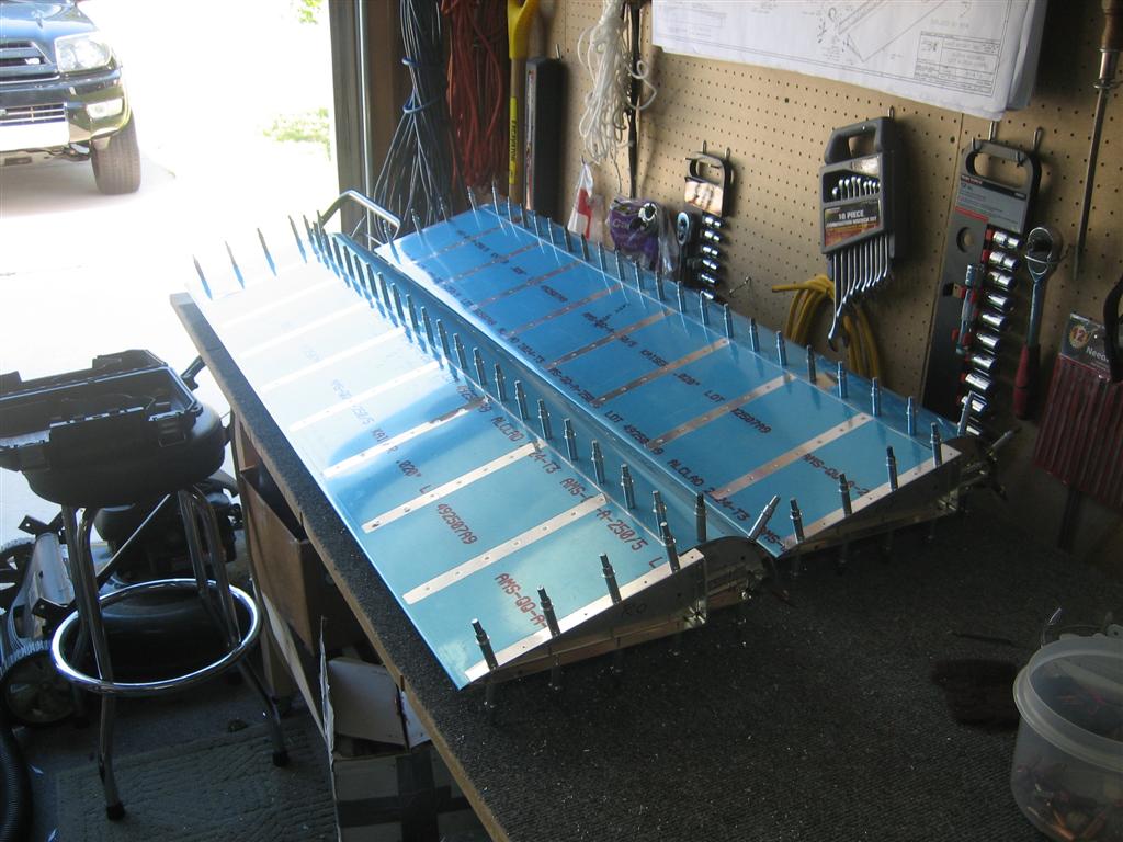 Then, after some rivet squeezing and priming, I propped it up on my handy-dandy cleco storage units for drying.