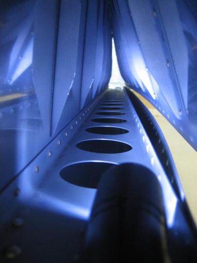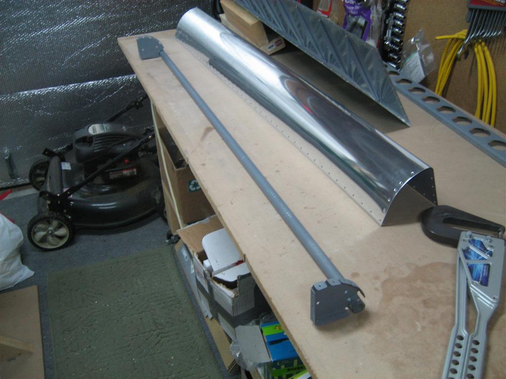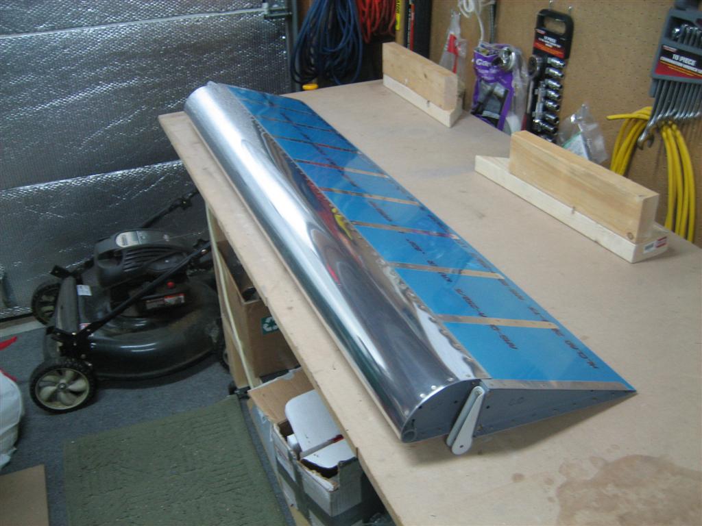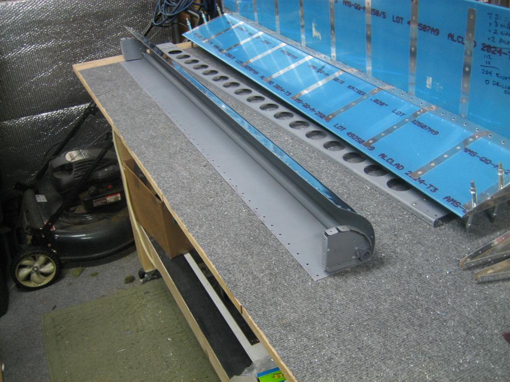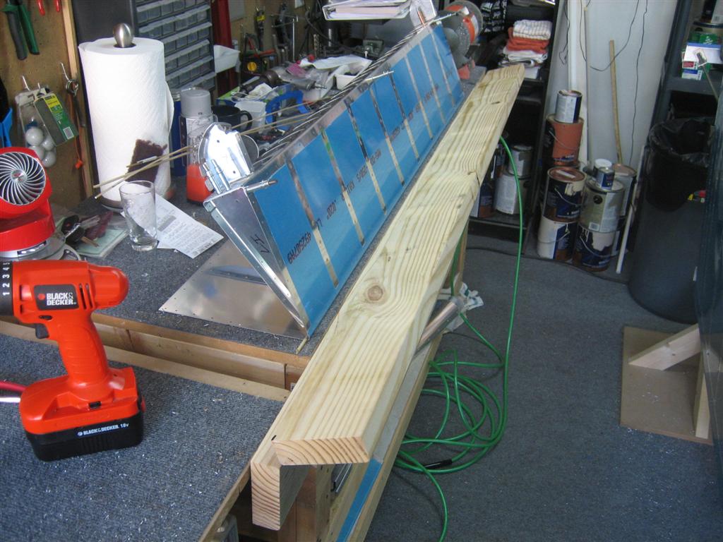 Well, I have all week off this week, and due to travel, random other activities, and general stay-at-home-dad responsibilities, I only managed to start working on the airplane today, Wednesday. My original plan was to get in 40 hours on the airplane this week, but I don’t think that’s going to happen, especially since I only managed to fit in 4 hours today. Anyway, I (we) decided that I’m going to start cleaning out some of the airplane parts from our workout room. In that light, I decided it was about time to start storing the right aileron on the right wing.