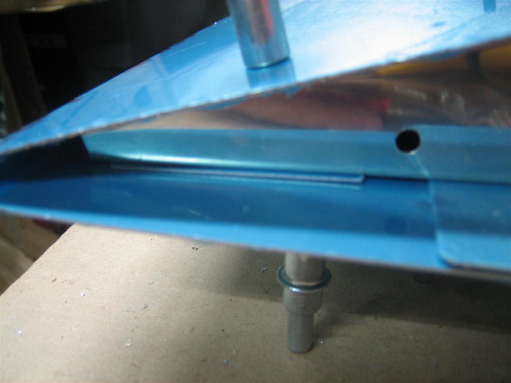 Okay, I didn’t do a good job of taking pictures here, but basically, I drew a line 1 and 1/16″ back from the tip of the rib, and then drew a line parallel to the front edge, but 2 diameters of the final rivet size (1/8″) away.
