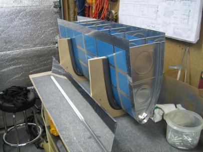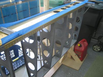 The blue tape is to prevent metal shavings from getting lodged in between the spar cap bars and the spar web.
