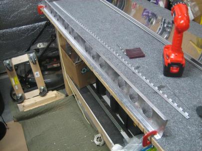 Now, let’s get to work. First thing, I very carefully put my beautiful right spar on the edge of the workbench and clamped the flange down very lightly. The spar will tip over onto the table (away from the camera) if the clamps let go, so I’m not too worried about clamping them down too much.