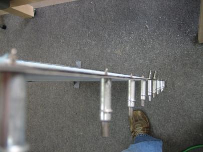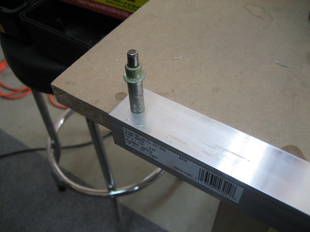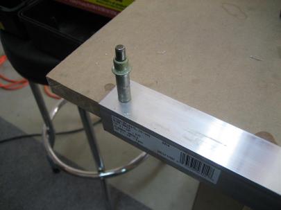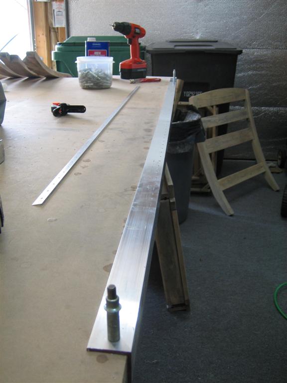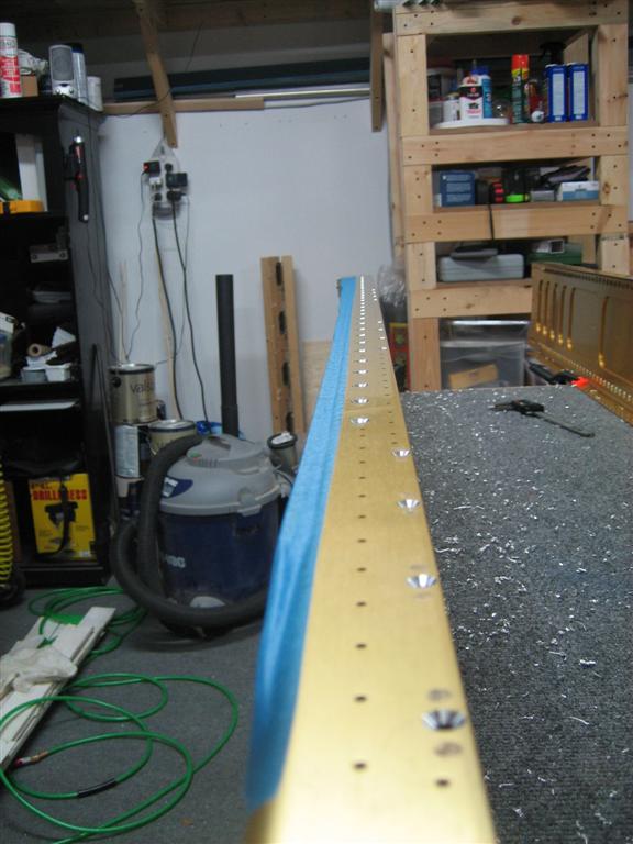 With that accomplished, I followed in many other builders’ footsteps and dimpled the leading edge by clecoing it to the countersunk counterbalance pipe balanced on a 2×4.