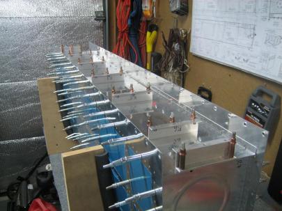 The foreground-most holes are for the aileron bracket and the main rib attachments, the clecoed row is for the leading edge rib attachments.