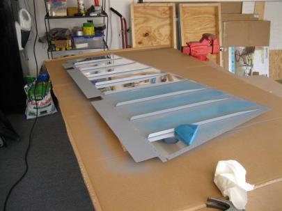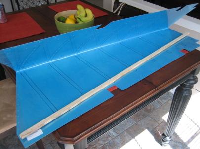 Here’s the horizontal stabilizer hung (very securely) with some red hooks through the pegboard and into some 2x4s.