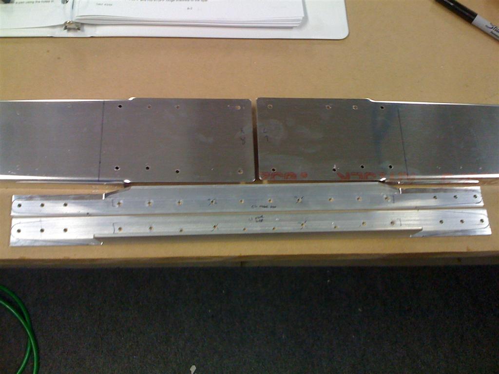 Then, after quick two-hour break for dinner and a couple TV shows, I went back outside after normal bedtime once I knew the rear spar parts had dried. Here they are clecoed together with the elevator center bearing (VA-146) and the hinge brackets.