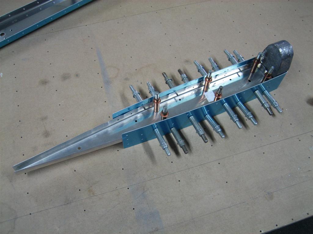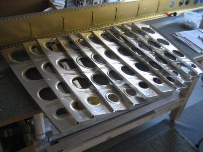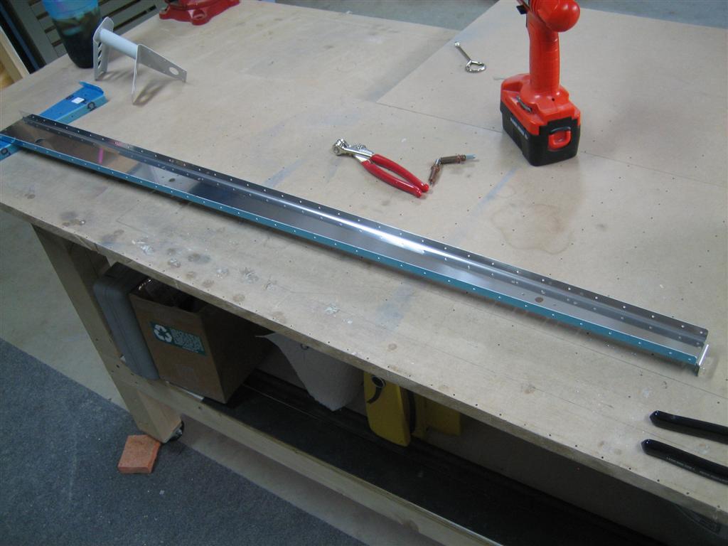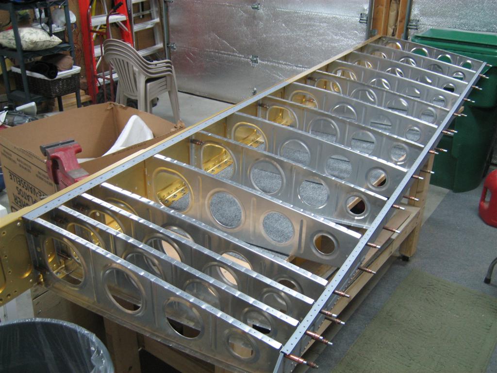 Then, I clecoed in the rear spar. Here, you can also see the hinge brackets waiting for the Goo Gone.