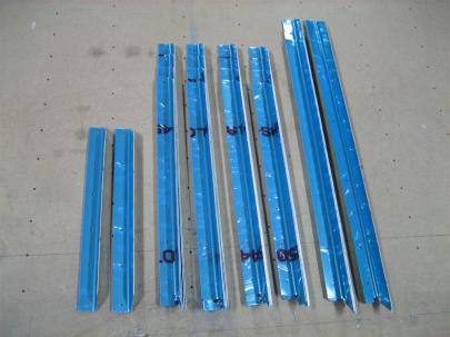 First thing after breakfast, I snagged the two VS spars and the spar reinforcement and headed into the kitchen to finish some surface prep. After about an hour, I had all three pieces scuffed up, cleaned, and back outside. Here is a shot during scuffing. You can see the top half has been scotchbrited and the bottom half is the raw part after removing the blue vinyl.