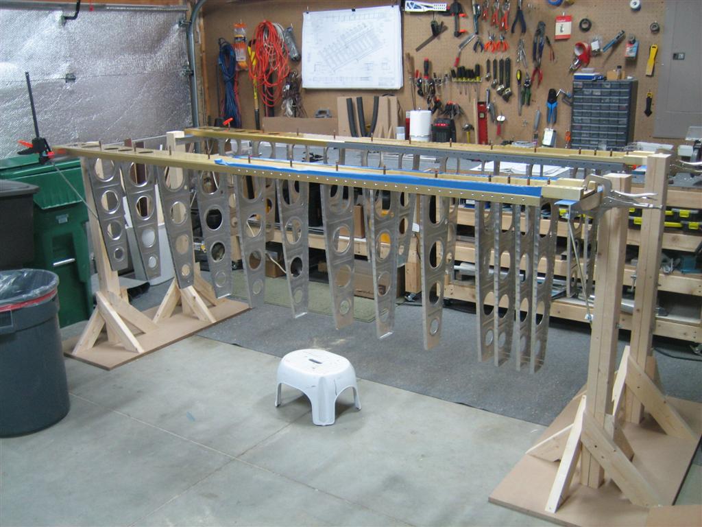 I followed Mike Bullock’s advice and clamped the rear spar to a couple of 2x4s. This let me matchdrill the rear spar vertically, which helps a lot with getting a perfectly straight hole.