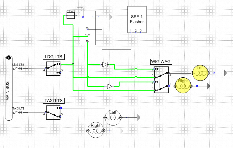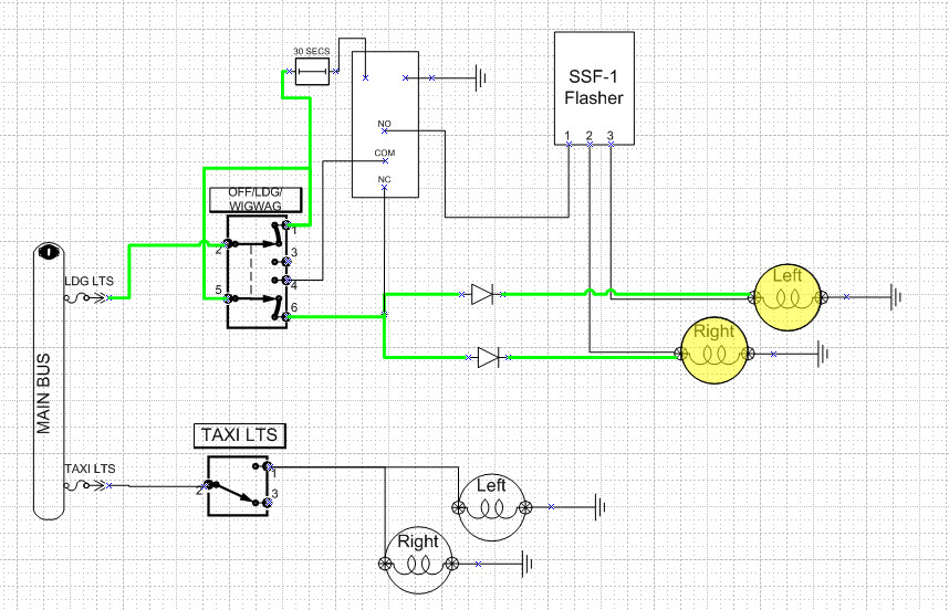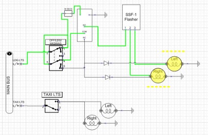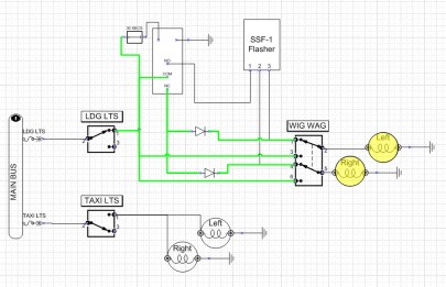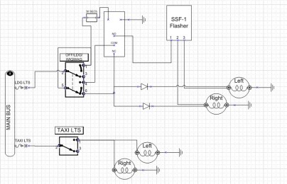 Then, I’ll use the wingtip lights for taxi/recognition, with wig-wag. I can use the smaller MR16s in the wing, and point one set wide, and one set toward the centerline. If I use regular halogen bulbs in these, I won’t have to use a warm up circuit, which is good, considering that when up at cruise and ATC calls with a traffic alert, I’ll be able to immediately start wig-wagging them for recognition. That gets rid of my need for an automatic warm up circuit (won’t be using HIDs for wig-wagging).