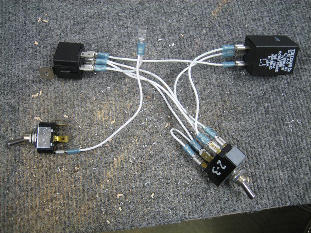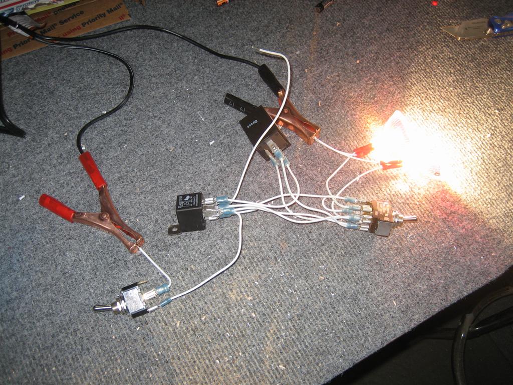 +14V will come in to the left, and the lights will be connected to the center terminals of the 2-3 switch in the picture. the fast-on connector at the top of the picture will eventually be connected to a timer circuit that will close the relay (top left) after 30 seconds.
