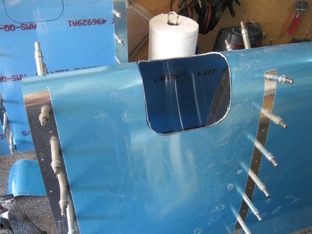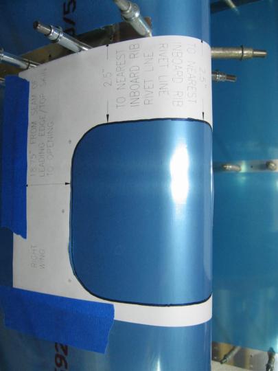 I also measured per the plans (18.75″ from the aft edge of the top of the leading edge skin to the top part of the opening here) and taped everything in place.