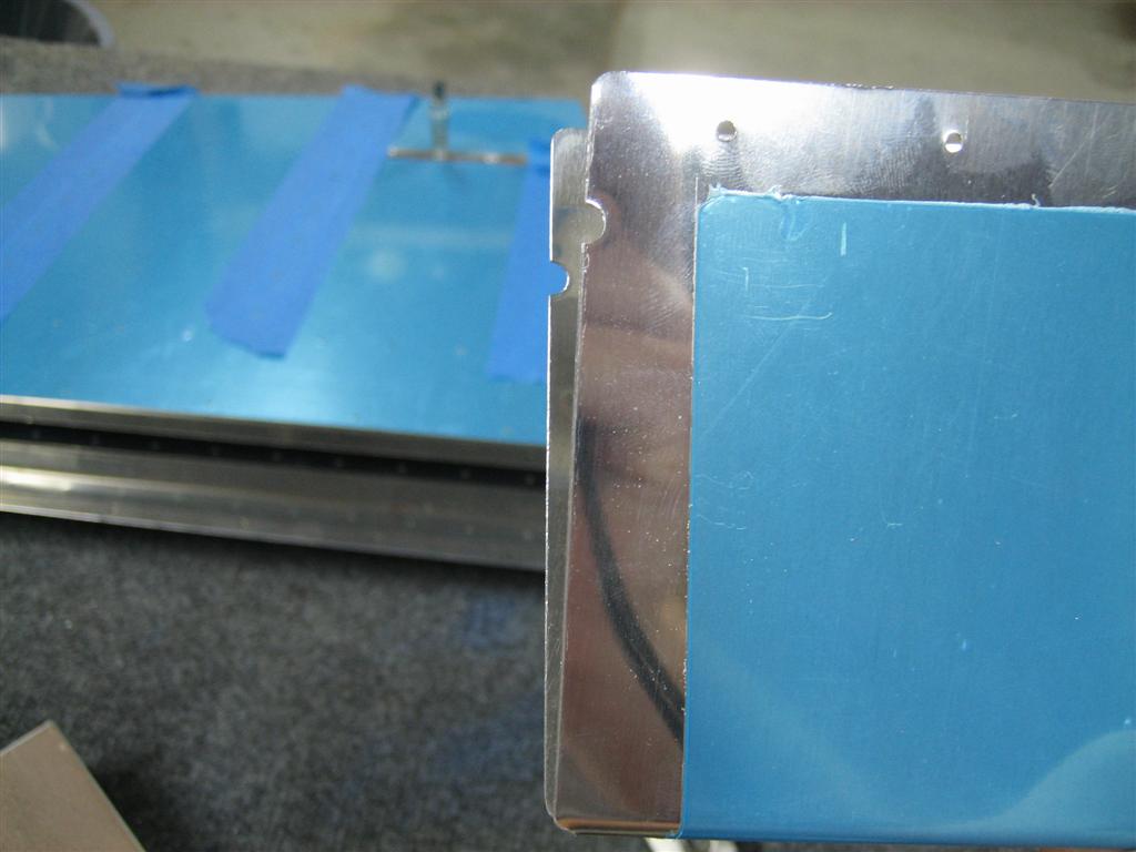 Then, I realized I’m going to have a hard time deburring, dimpling, and scuffing with the blue vinyl on. [sigh] Off with the vinyl, re-cleco, redraw my line, then back off to deburr, dimple, and scuff.