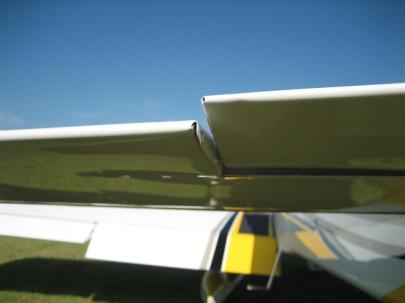 Here's a closeup. You can see the edge near the top of the tab is angled a little left. This is how it comes from the factory. The marker line and aft portion of the tab are both perfectly perpendicular to the hinge line (line through the center of the rivet holes).